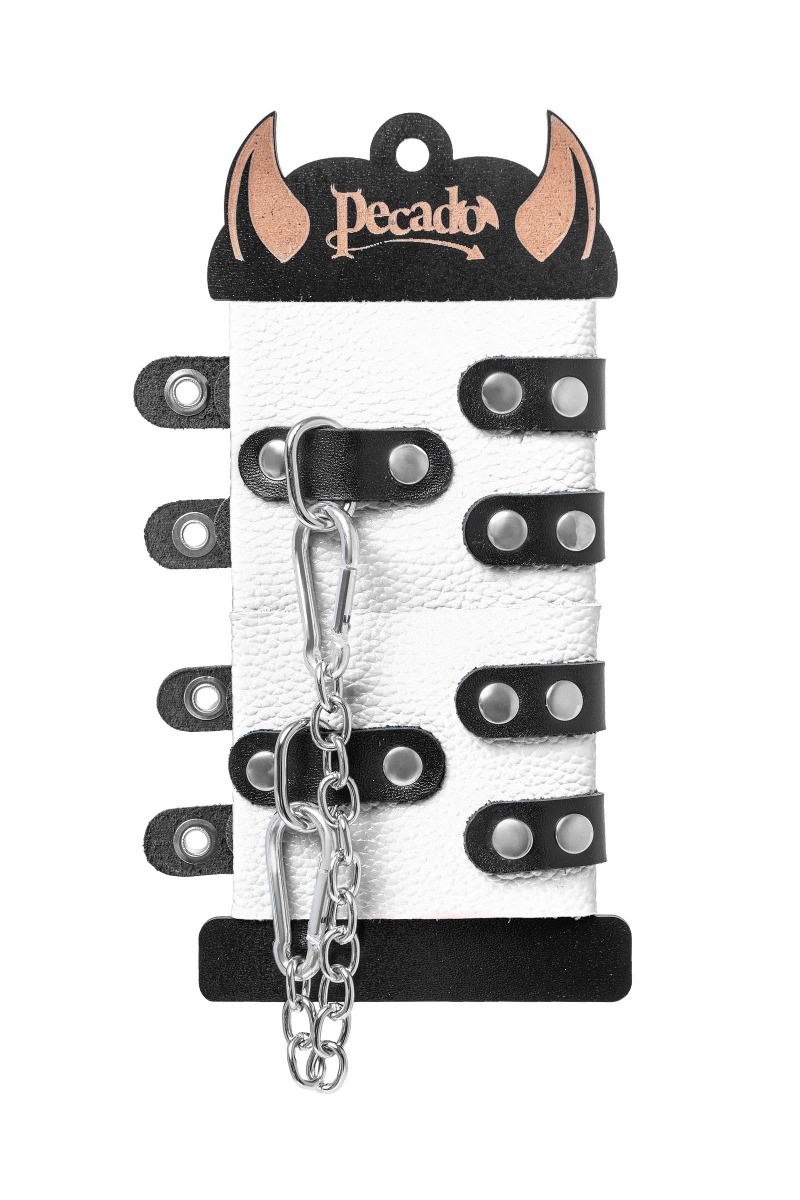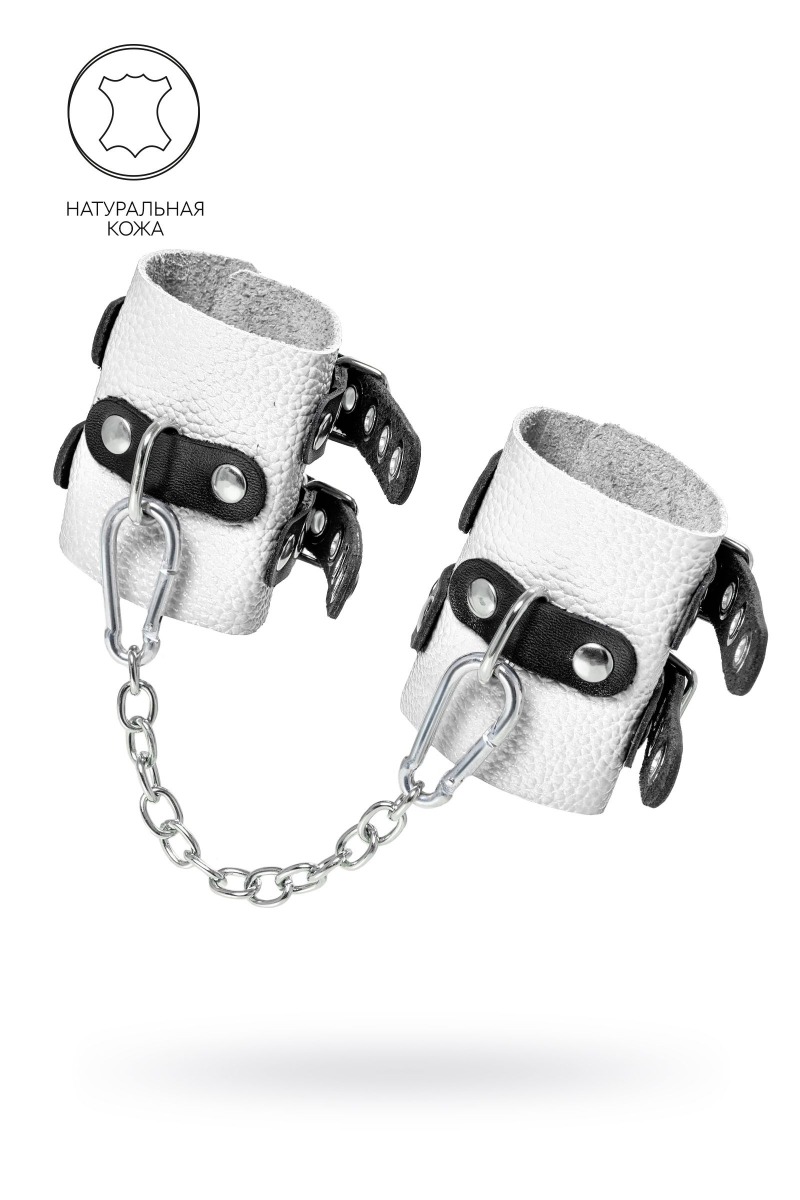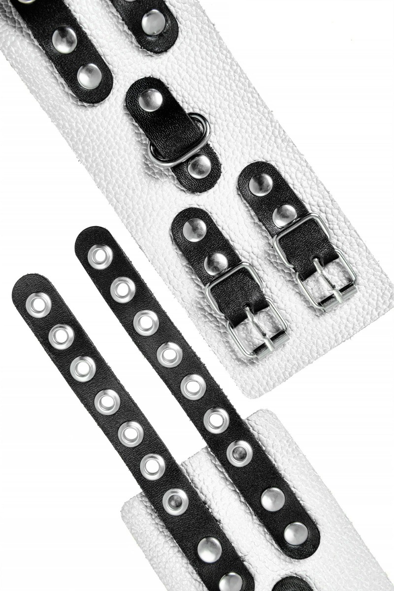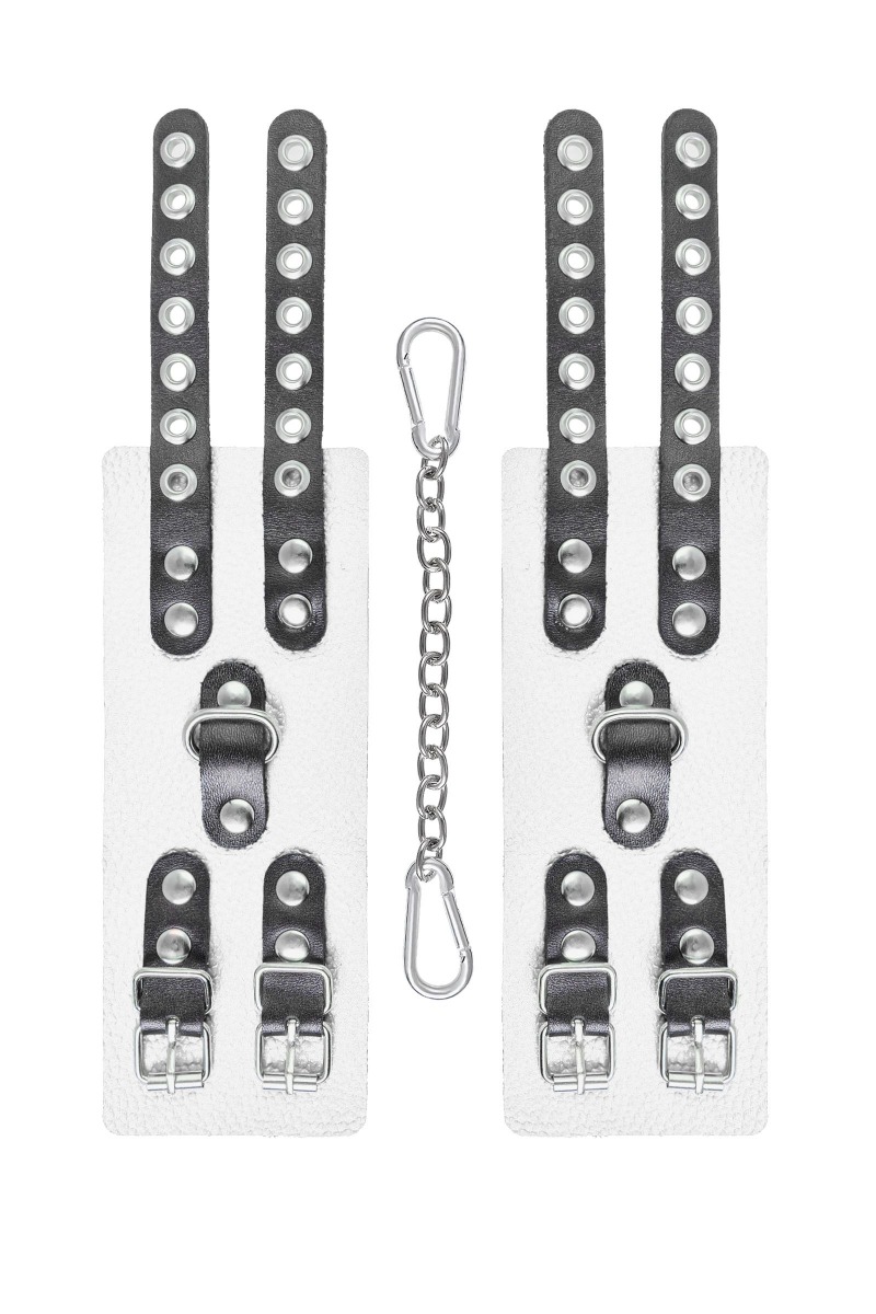 Основатели бренда уверены: лучший способ избавиться от искушения - поддаться ему! Мягкие, белые, кожаные наручники с двумя чёрными, жёсткими ремнями могут стать стильным аксессуаром, а могут послужить вашим целям по своему прямому назначению. Частичное обездвиживание и невозможность двигать руками дают вам полную власть над партнером – взрослые игры для взрослых. Наличие двух колец и карабинов, соединенных между собой металлической цепочкой, позволяет использовать изделие как раздельно – аксессуар-манжеты, так и как наручники для фиксации. К широким металлическим кольцам также можно присоединить и другие аксессуары при помощи карабинов. Благодаря универсальному размеру наручники могут использоваться и мужчинами, и женщинами. Длина манжет - 18 см, ширина - 7 см. Длина сцепки - 17 см.