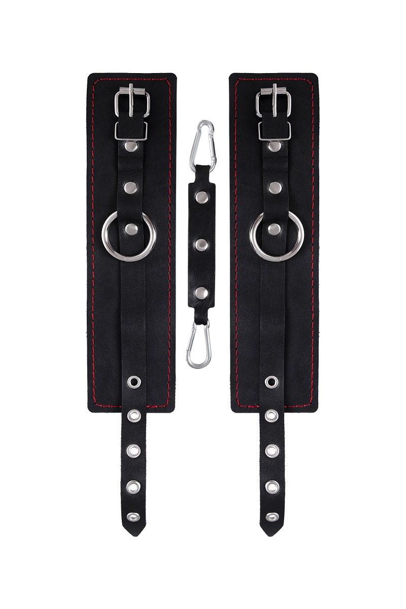 Эти однослойные кожаные оковы с контрастной строчкой красного цвета могут стать стильным аксессуаром, а могут послужить вашим целям по своему прямому назначению. Частичное обездвиживание и невозможность двигать руками или ногами дают вам полную власть над партнером – взрослые игры для взрослых. Наличие двух колец и карабинов, соединенных между собой кожаным ремешком, позволяет использовать изделие как раздельно – аксессуар-манжеты, так и как оковы для фиксации. К широким металлическим кольцам также можно присоединить и другие аксессуары при помощи карабинов. Благодаря универсальному размеру оковы могут использоваться и мужчинами, и женщинами. Размер легко регулируется с помощью металлических пряжек, органично вписывающихся в общий стиль. Длина манжет - 25 см, ширина - 6,5 см. Длина сцепки - 17 см.