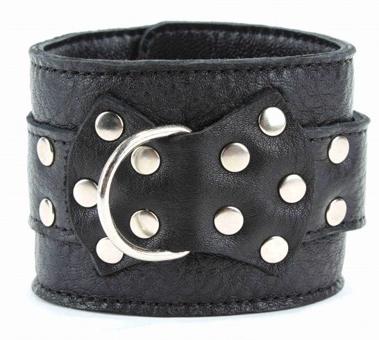 Кожаные наручники черного цвета. Украшены заклепками и соединяются между собой цепью с карабинами. Размер наручников регулируется при помощи застежки Ширина - 6 см. Длина цепочки - 15,5 см.